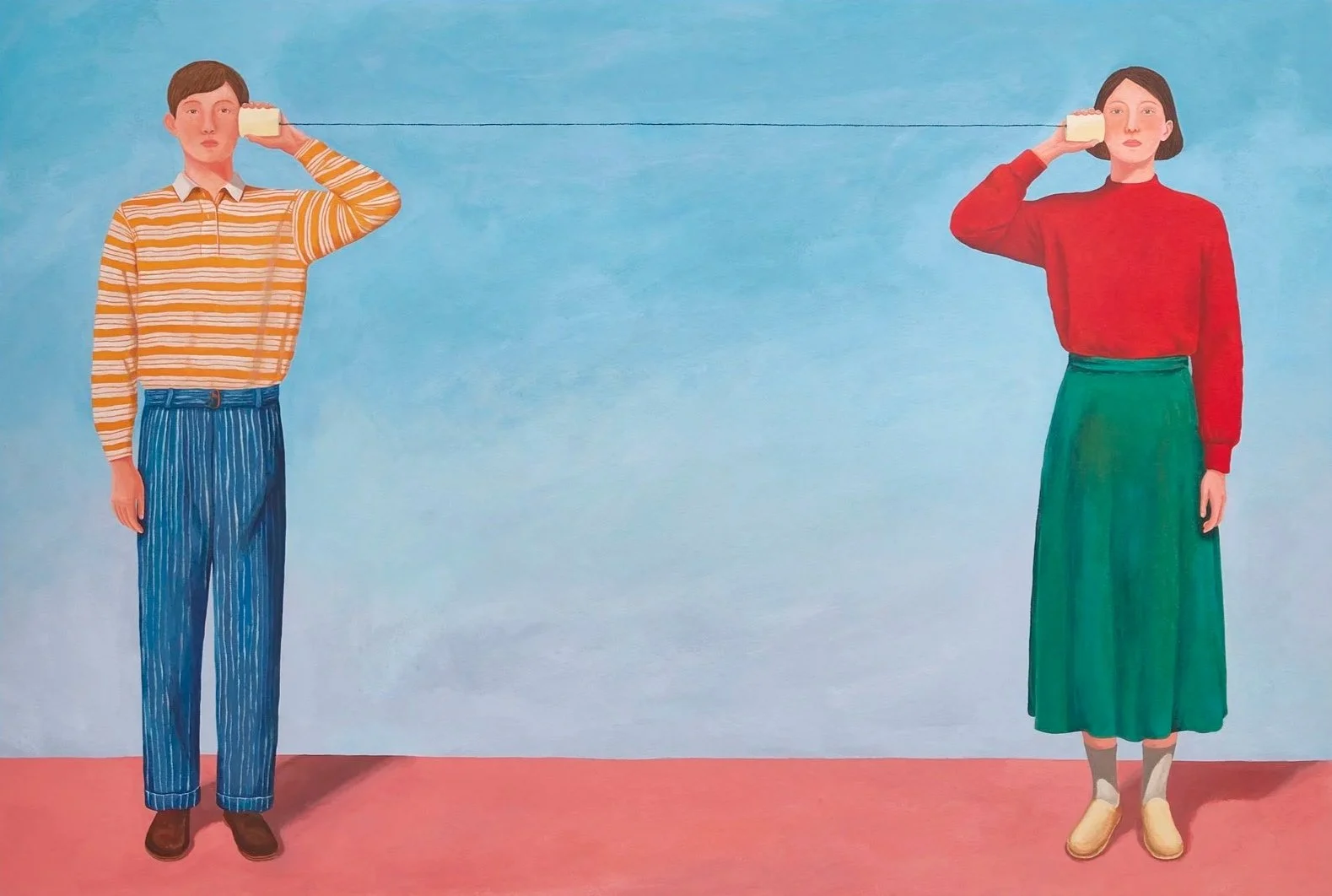 작품 속 인물들은 종이컵 전화기를 들고 서로 연결되어 있지만, 두 사람 모두 ‘듣는 행위’에만 머물러 있다.